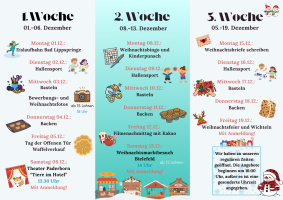 Dezemberprogramm 2025 Vom 01.12-19-12-2025 haben wir uns wieder etwas Tolles für euch einfallen lassen! Meldet euch fix an damit ihr dabei sein könnt! Die Anmeldezettel könnt ihr bei uns persönlich abholen! Wir freuen uns auf euch!